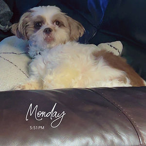 White Shih Tzu with brown spots has a goatee and a mohawk